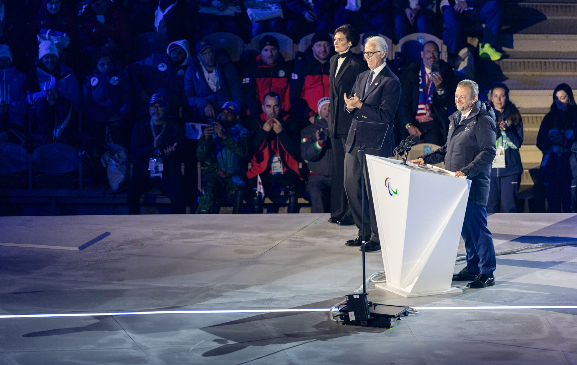 V programe nechýbala ani spomienka na Sira Ludwiga Guttmanna, zakladateľa paralympijského športu v Stoke Mandeville, či historický prierez doterajšími hrami. ZPH si práve v tomto roku pripomínajú 50 rokov od prvých hier vo švédskom Örnsköldsviku. Na ploche potom defilovali vlajky a menovky 56 zúčastnených krajín, ktoré niesli dobrovoľníci, sprevádzané vybranými delegovanými športovcami. Zvyšok výprav im na video prestrihoch kýval na podporu z paralympijských dedín v Miláne, Cortine a Predazze. Ako prvá sa predstavila Andorra, na ploche zaviala aj slovenská vlajka. Vlajkonosičom výpravy bol Miroslav Haraus, ktorý sa objavil na prestrihu z Cortiny spolu s tímom a vlajkou.